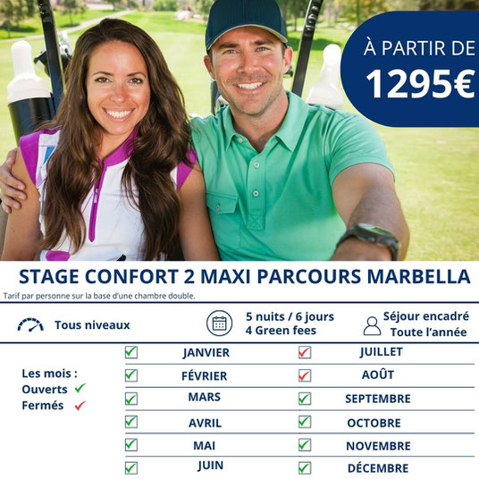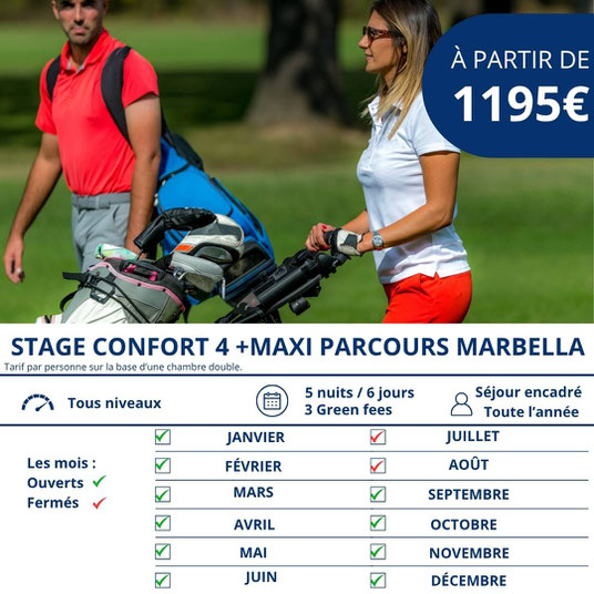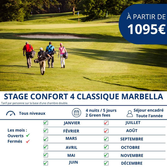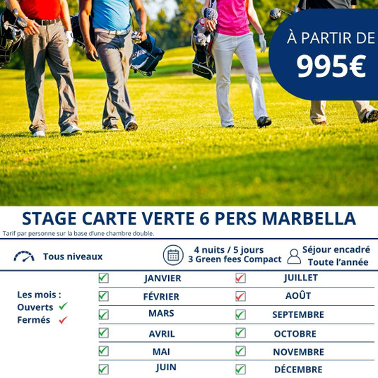« Ce stage s’adresse exclusivement aux personnes qui n’ont encore jamais pratiqué le golf et qui souhaitent obtenir leur Carte Verte dans un cadre structuré et bienveillant. À Marbella, vous bénéficiez d’un enseignement progressif, d’une pratique encadrée sur le parcours et d’un accompagnement personnalisé pour réussir sereinement votre certification. »